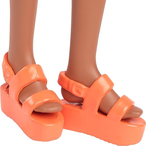 - Questa alta bambola Barbie sfoggia un'acconciatura con capelli per metà raccolti e per metà sciolti! Il suo look è caratterizzato da dettagli divertenti che fanno risaltare la sua personalità, come un girocollo rosa e un paio di sandali con plateau arancioni.