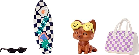 - Anche il suo cucciolo ha una personalità EXTRA, con occhiali da sole oversize a forma di smile e una tavola da surf a scacchi!