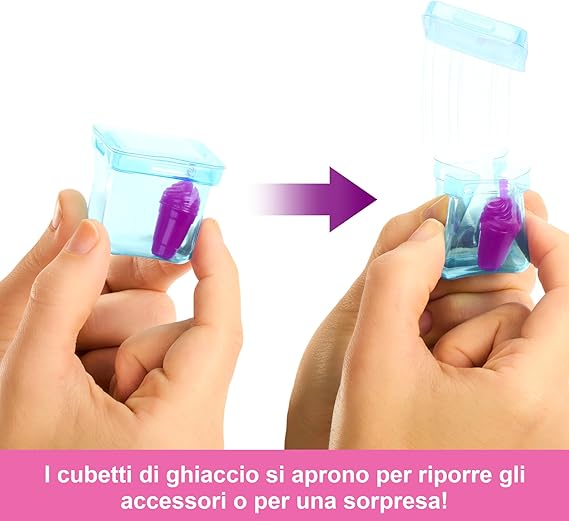 - Scopri altri accessori all'interno dei cubetti di ghiaccio che si aprono davvero, come la mini bevanda da strizzare e pattini a rotelle per la bambola Barbie. Usa i cubetti come contenitori o riaprili quante volte vuoi!