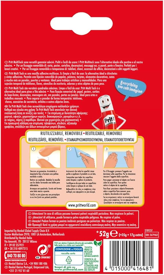 - Contenuto - Pritt Multi Tack gommini adesivi removibili e riutilizzabili, adesivi per porte, pareti e finestre non tossici, adesivo carta, cartoncino, poster e lavoretti, 1 confezione da 95 pezzi