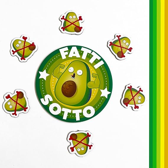 - Cosa c'è nella scatola? 120 Carte, 2 Avocado, 6 Ferite da Avocado, 1 Distintivo "Fatti sotto”, 1 Regolamento